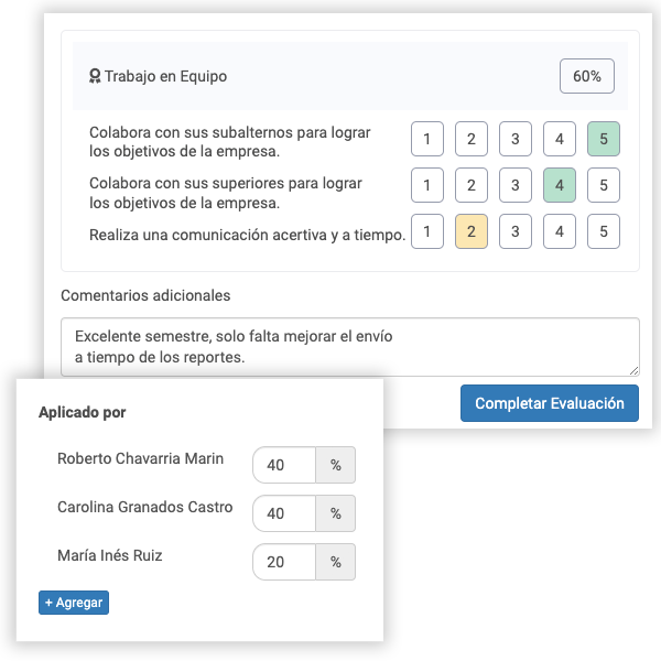 Puedes asignar a una o más personas como evaluadoras (incluyendo a la persona evaluada), e indicar la ponderación de cada evaluador en el resultado final.