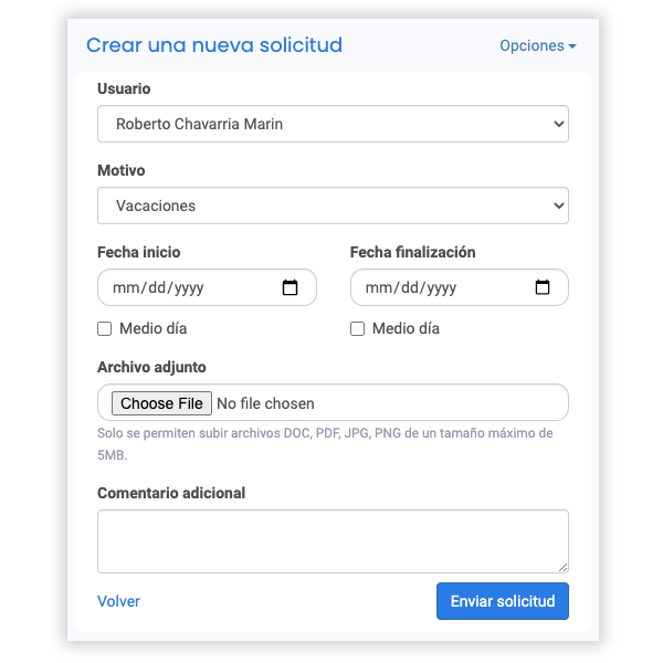 Permite registrar ausencias e incapacidades y subir documentos relacionados (como justificantes médicos).